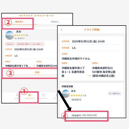 4.同乗者情報欄に記載されている電話番号を確認