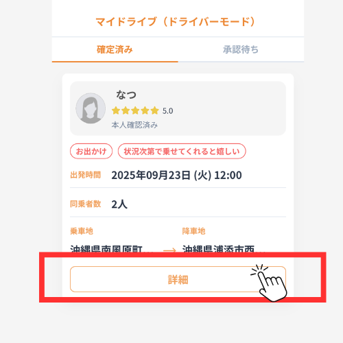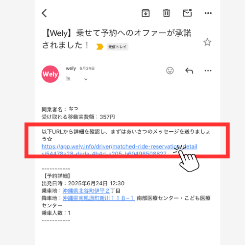 同乗者(乗せて予約者)が承認操作をすると、登録したメールアドレス宛に【オファーが承認されました】の内容のメールが届きます。