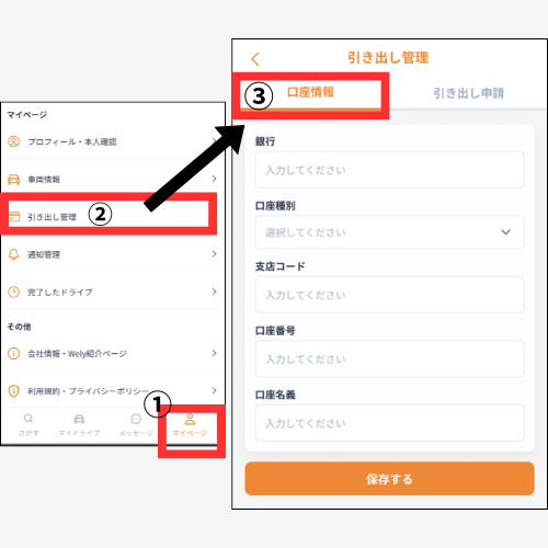 ①『マイページ』→②『引き出し管理』→③『口座情報』を選択してください。