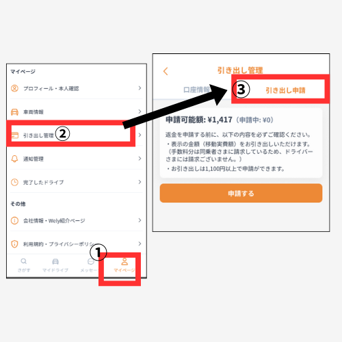 ③ドライバーが「引き出し申請」を行うと、Welyを通じて登録口座へ振込されます。