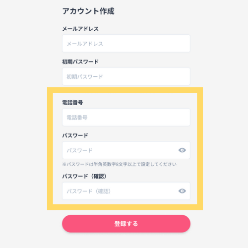 電話番号をハイフン入りで入力し、パスワードを設定してください。