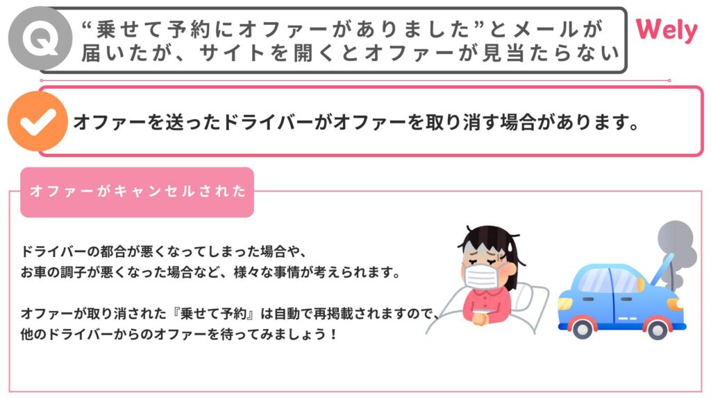 オファーを送ったドライバーがオファーを取り消す場合があります。ドライバーの都合が悪くなってしまった場合や、お車の調子が悪くなってしまった場合など、様々な事情が考えられます。