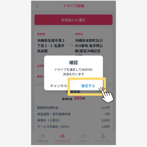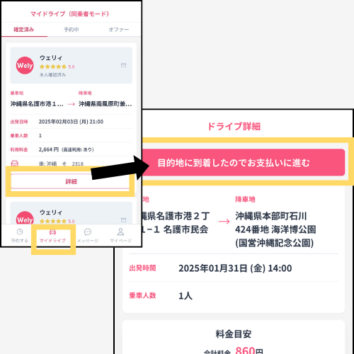 目的地に到着したら、『マイドライブ』→『確定済み』→『詳細』→『目的地に到着したのでお支払いに進む』を押してください。