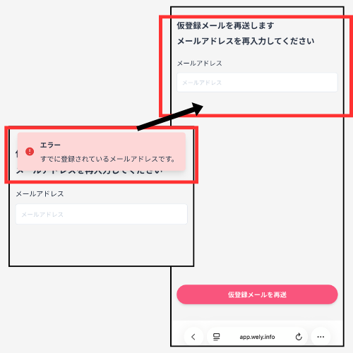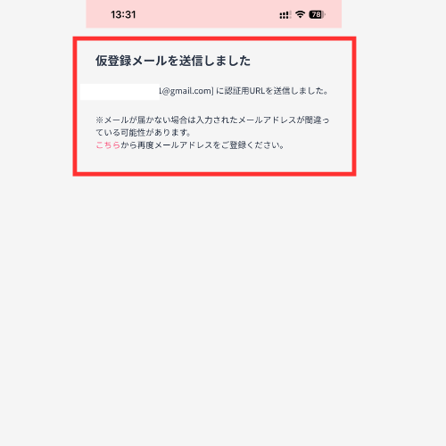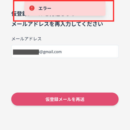 とエラーが出た場合は、そのあとに表示される仮登録メールを再送を試してください。