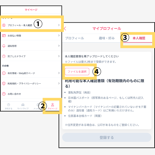 ①『マイページ』→②『プロフィール』→③『本人確認』タブをクリック→④『ファイルを選択』