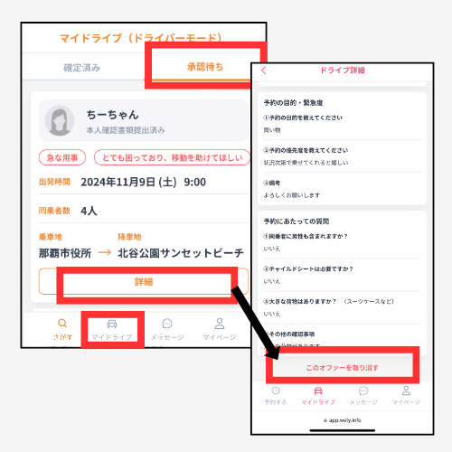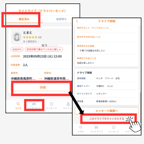 承認されてドライブが確定した場合かで操作方法が異なります。