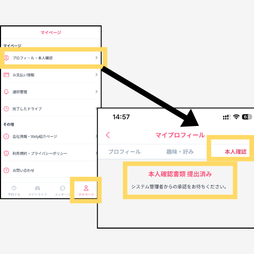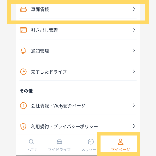 『マイページ』→『車両情報』からお車の情報を入力し、免許証と車検証の提出をお願いいたします。