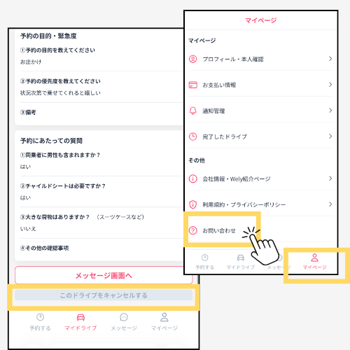 『マイページ』→『お問合せ』からキャンセルとなったドライブの詳細、理由、ドライバーさんとキャンセル合意済みかどうか をお知らせください。