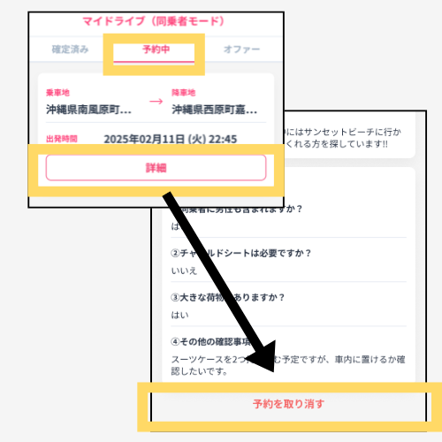 やむを得ず体調不良や緊急事態でキャンセルが必要な場合には、ドライバーさんへメッセージにてその旨を真摯に伝え、お詫びをしたうえで、事務局へのご連絡をお願いいたします。