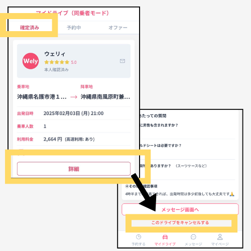 ドライバーからオファーが来て、すでに承認して確定済みの予約は出発2時間前まで予約の取り消しが可能となっております。